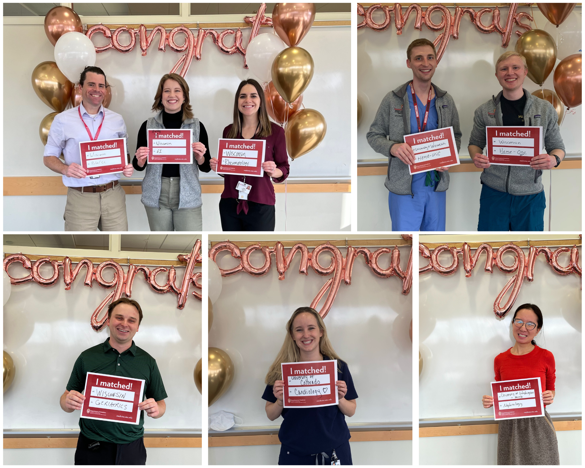 Above, clockwise from top-left: chief resident John Davis, MD; chief resident Sarah Floden, MD, holding sign for chief resident Gabby Waclawik, MD; chief resident Nadia Sweet, MD; Eric Mehlhaff, MD; Devon Miller, MD; Cassandra Chiao, MD; Chrissy Healy, MD; and Jon Leja, MD. Credit: Nadia Sweet, Sarah Floden and Natalie Weidner.